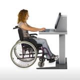 Das neue Profil No.4 | barrierefrei kann sowohl von stehenden, als auch von in einem Rollstuhl sitzenden Personen problemlos bedient werden kann. Es verfügt über einen hochwertigen Hubmotor, mit dessen Hilfe der Anwender sowohl das Display als auch das Tischelement stufenlos an jede gewünschte Arbeitshöhe anpassen kann (min. 700 mm bis max. 1.200 mm). Diese Justierung erfolgt über zwei gut zu erreichende Kippschalter an der Front des Tischelements. Ein Rollstuhlfahrer kann das System bequem unterfahren - die in der Richtlinie BIMK vorgeschriebenen Maße hinsichtlich Unterfahrbarkeitstiefe- und Breite sowie die maximalen Greifbereiche für Rollstuhlfahrer werden hierbei vorbildlich eingehalten.