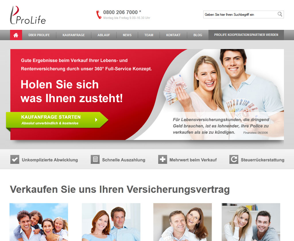Die >a href=http://www.prolife-gmbh.de//a< engagiert sich rund um den Ankauf von Lebensversicherungen, Unfallversicherung mit Beitragsrückgewähr, Rentenversicherungen sowie Bausparverträgen. Durch das ganzheitliche Mehrwertkonzept der ProLife GmbH wird eine sichere und zeitnahe Auszahlung des Geldes gewährleistet. Die rund 14 Mitarbeiter des Unternehmens zeichnen sich durch ihre hohe Verbraucherorientierung aus und helfen bei Fragen jeder Art gerne weiter. Dank rechtlicher und versicherungsmathematischer Nachkalkulation garantiert die ProLife GmbH im Rahmen ihres fachkompetenten Teams eine möglichst rentable Abwicklung des Ankaufs.