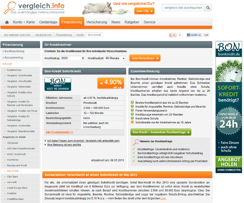Alternativ bietet Vergleich.info konkrete Kreditvergleiche, z. B. für Rentner und Pensionäre oder für Selbstständige auf http://www.vergleich.info/finanzierung/kredit/kreditrechner/ an, die sich an den einzelnen Personengruppen orientieren.