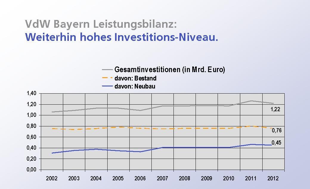 Die Verbandsmitglieder haben 2012 1,2 Mrd. Euro in Neubau, Modernisierung und Instandhaltung investiert. Sie bauten rund 2.000 Wohnungen (-11,6%), darunter knapp 1.200 Sozialwohnungen. "Die Investitionen sind fast auf Vorjahresniveau geblieben, aber damit konnte aufgrund deutlich gestiegener Kosten weniger gebaut und modernisiert werden", erläutert Kroner.