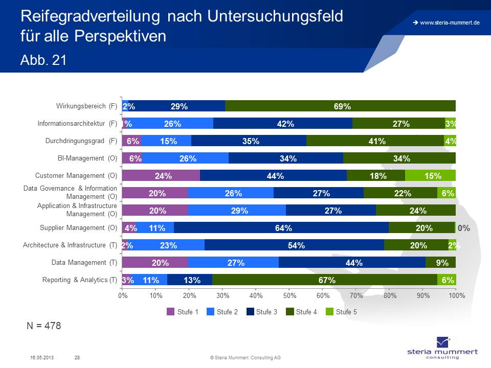 Die Studie "biMA®2012/13" (Business Intelligence Maturity Audit) wurde nach den Jahren 2004, 2006 und 2009 bereits zum vierten Mal durchgeführt. Dabei kommen die Teilnehmer erstmals nicht nur aus dem deutschsprachigen Raum, sondern aus 20 europäischen Ländern. Mit mehr als 650 Teilnehmern gehört die Studie zu einer der größten Analysen zum Thema Business Intelligence in Europa. Die methodische Basis bilden das von Steria Mummert Consulting entwickelte BI-spezifische Reifegradmodell Business Intelligence Maturity Model (biMM®) sowie die darauf aufbauende Analysemethode Business Intelligence Maturity Audit (biMA®).