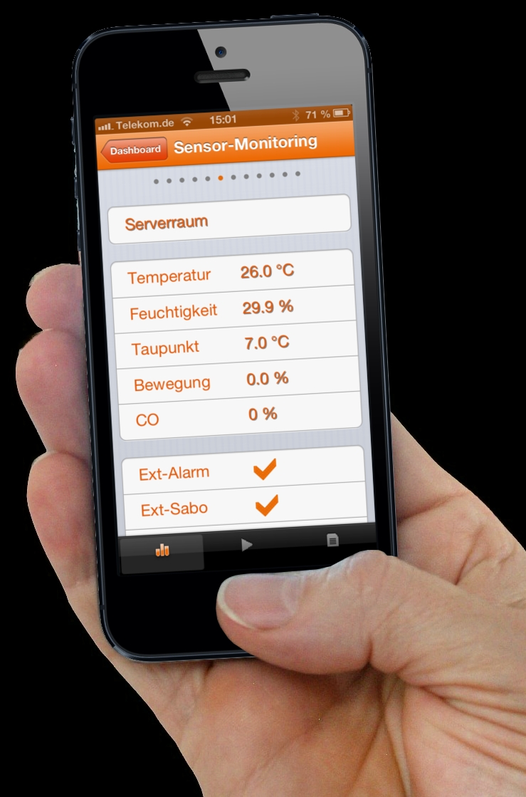 Version 3.30 erweitert den Einsatz dahin gehend, dass die wichtigsten Funktionen per App nun auch mobil zur Verfügung stehen. Die entsprechende iPhone-App unterstützt folgende Geräte: AlarmManager-PRO, MultiSensor-LAN, MultiSensor-RACK. Sie ist kompatibel zu allen iPhone-Geräten ab Version 3GS sowie iPod touch (Generation 3 bis 5) und iPad.