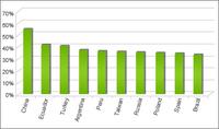 Die durchschnittliche Anzahl der kompromittierten PCs weltweit beträgt ca. 31 Prozent. China steht ? als einziges Land mit mehr als 50 Prozent Infektionsquote ? auf dem ersten Platz der Top Ten der am stärksten betroffenen Länder, gefolgt von Equador (41 %) und der Türkei (40 %). Argentinien (38 %), Peru (37 %), Taiwan (36 %), Russland (36 %), Polen (34 %), Spanien (34 %) und Brasilien (33 %) komplettieren die Liste.