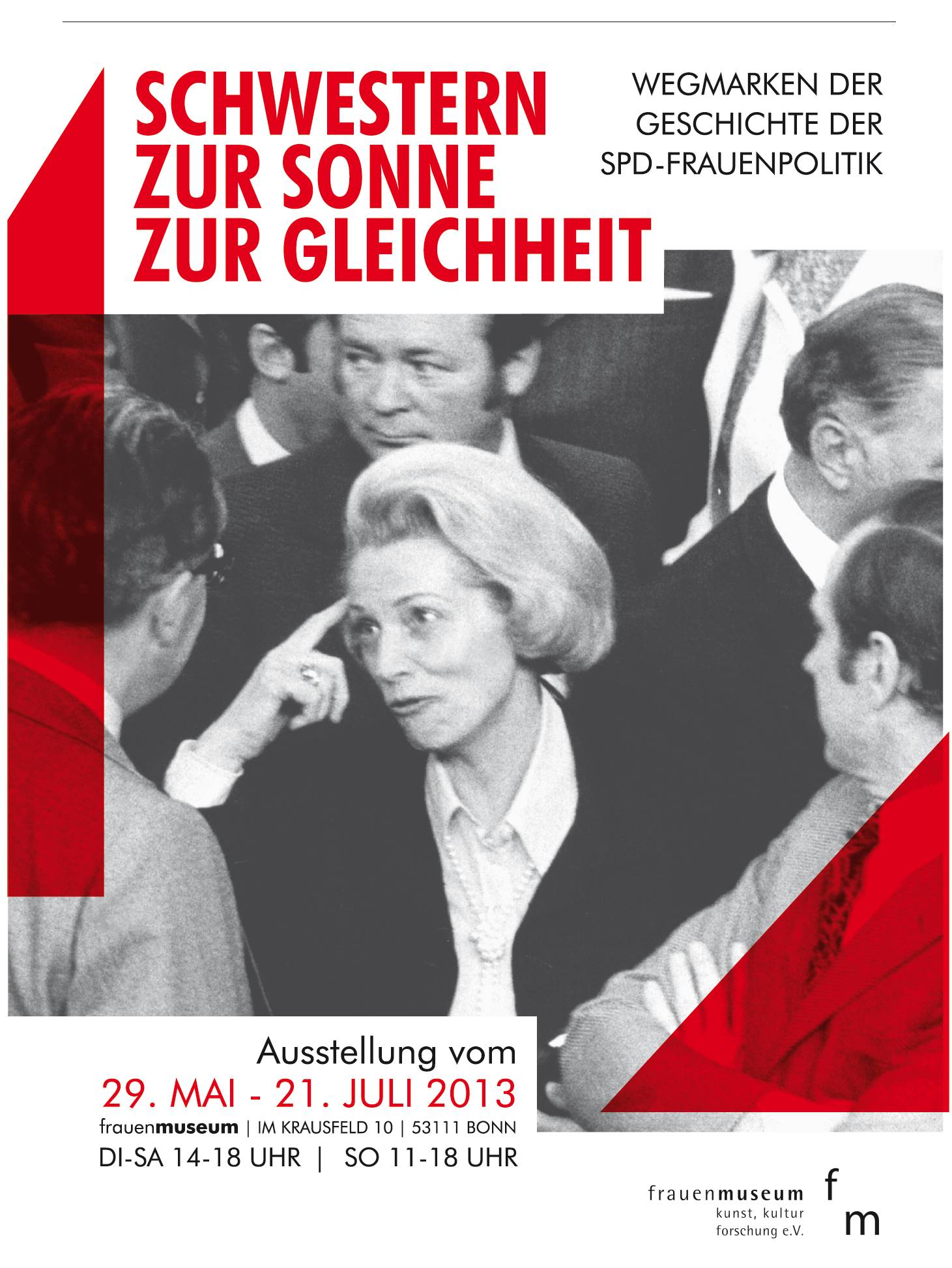 (IINews) - Das Bonner Frauenmuseum präsentiert vom 28. Mai bis 21. Juli 2013 die Geschichte der SPD-Frauen anlässlich des 150. Parteijubiläums. Neben Text-Bild-Elementen werden in der Ausstellung historische Plakate zur SPD-Frauenpolitik gezeigt sowie Karikaturen, Autogrammkarten und originelle Reminiszenzen von einzelnen Politikerinnen. Es wird ein Bogen von den ersten politischen Frauenrechten über den langen Kampf gegen den § 218 bis zur heute propagierten Chancengleichheit gespannt. 29 SPD-Politikerinnen werden vorgestellt, darunter die Parteitheoretikerin Rosa Luxemburg, die Gründerin der AWO Marie Juchacz, die Widerstandskämpferin Johanna Kirchner, die Juristin Elisabeth Selbert, die für die Gleichberechtigung im Grundgesetz kämpfte. Einige hatten als erste Frauen bedeutende politische Funktionen inne, wie die Ministerin Martha Fuchs, die Oberbürgermeisterin Louise Schroeder, die Präsidentin des Bundestags Annemarie Renger, die Ministerpräsidentin Heide Simonis und Jutta Limbach, die erste Präsidentin des Bundesverfassungsgerichts.