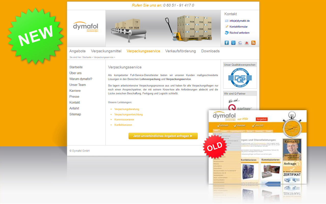 Mittendrinn statt nur dabei - so das erklärte Ziel der Neugestaltung des Webauftritts der Dymafol GmbH. Mit nun knapp drei Jahrzenten Erfahrung im Bereich Verpackungen und Dienstleitungen möchte Dymafol neue Wege beschreiten und dabei auf bewährtes zurück greifen - dem Kundenservice. Nachdem das Unternehmen das eigene Corporate Design überabeitet hatte, sollte nun die Umsetzung eines kundenfreundlichen Webauftritts folgen.