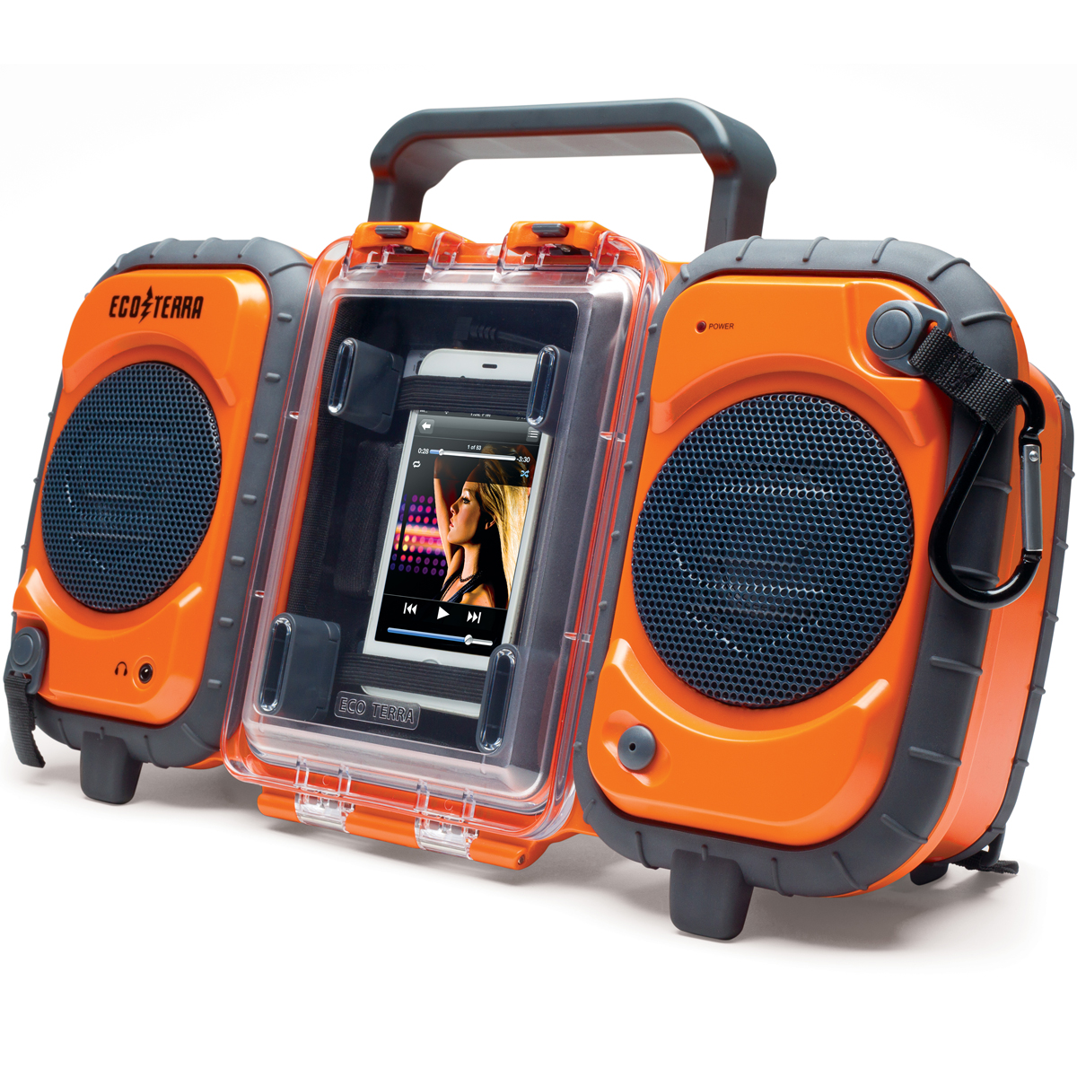 Das wasserdichte Audio Case Eco Terra Boombox sorgt überall für gute Klänge: MP3-Player, iPhone 4/4S, 5 sowie Android, Windows und Blackberry Smartphones können in das luftdichte Case geschlossen werden und sind so sicher vor Sand, Wasser und Sonne. Die Boom Box im industriellen Design hat zwei wasserdichte Lautsprecher für optimale Tonqualität!