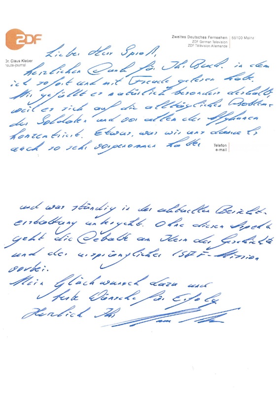 herzlichen Dank für Ihr Buch, in dem ich sofort und mit Freude gelesen habe. Mir gefällt es natürlich besonders deshalb, weil es sich auf die alltäglichen Probleme der Soldaten und vor allem der Afghanen konzentriert. Etwas, was wir uns damals auch so sehr vorgenommen hatten und was ständig in der aktuellen Berichterstattung untergeht. Ohne diesen Aspekt geht die Debatte am Kern der Geschichte und der ursprünglichen ISAF-Mission vorbei.