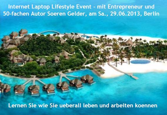 Am 29.06.2013 wird der erfolgreiche 50fache Autor, Entrepreneur und Businesscoach Soeren Gelder eine Veranstaltung in der Naehe von Berlin geben. Das genaue Hotel wird nicht bekannt gegeben und kann als das Davos Event der Wirtschaft in Deutschland genannt werden. Es geht um den Internet Laptop Lifestyle Event. Leben und arbeiten am Ort Ihrer Wahl per Internet und Laptop und Smartphone. Das bedeutet weltweite Freiheit.