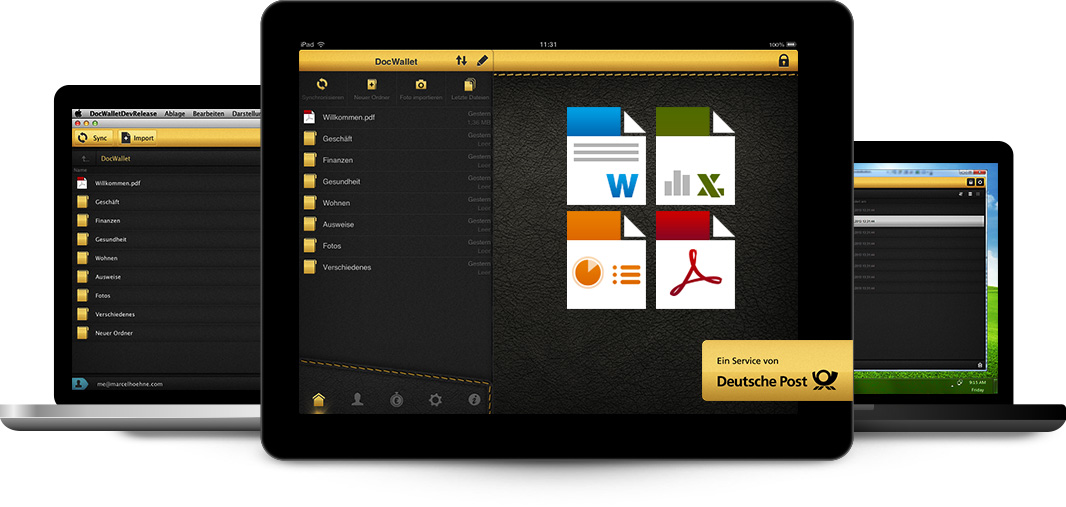 Mit DocWallet bietet die Deutsche Post ein leicht zu bedienendes System für alle, die Wert auf hohe Datensicherheit beim Einsatz mobiler Endgeräte legen. Unterstützt werden unter anderem die gängigen Dateiformate: Microsoft Word, Excel und Powerpoint sowie PDF-Dokumente. Außerdem lassen sich mit der neuen Version Bilder importieren, Dokumente kabellos via AirPrint drucken und Präsentationen über AirPlay abspielen. Mit dem Update können Dokumente zudem fotografiert und verschlüsselt in DocWallet abgelegt werden.