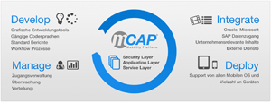 Die Plattform basiert auf vier Säulen, welche den gesamten Lebenszyklus einer mobilen Unternehmensapplikation abbilden - von der Entwicklungsphase über das App-Management bis zur Prozess-Anbindung von Systemen wir SAP und Oracle. Ziel des Stuttgarter Mobile-Enablers ist, Unternehmen mithilfe der mCAP einen nachhaltigen Wettbewerbsvorteil zu verschaffen.