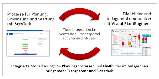SemTalk und Visual PlantEngineer können hier in SharePoint in hervorragender Weise integriert werden. Die Arbeitsergebnisse des Visual PlantEngineers werden direkt in den Prozessmodellen abgelegt und können dort auch zur Bearbeitung geöffnet werden. So sehen beispielsweise die Service-Ingenieure nicht nur die Prozessbeschreibung für die Wartungstätigkeiten, sondern können auch direkt die funktionalen Details der Anlage einsehen. Für die Konstrukteure ergibt sich ein ebenso integriertes Bild. Ändern sich Teile der Anlagenfunktionalität im Fließbild, können gleichzeitig die erforderlichen Prozesse geändert werden.