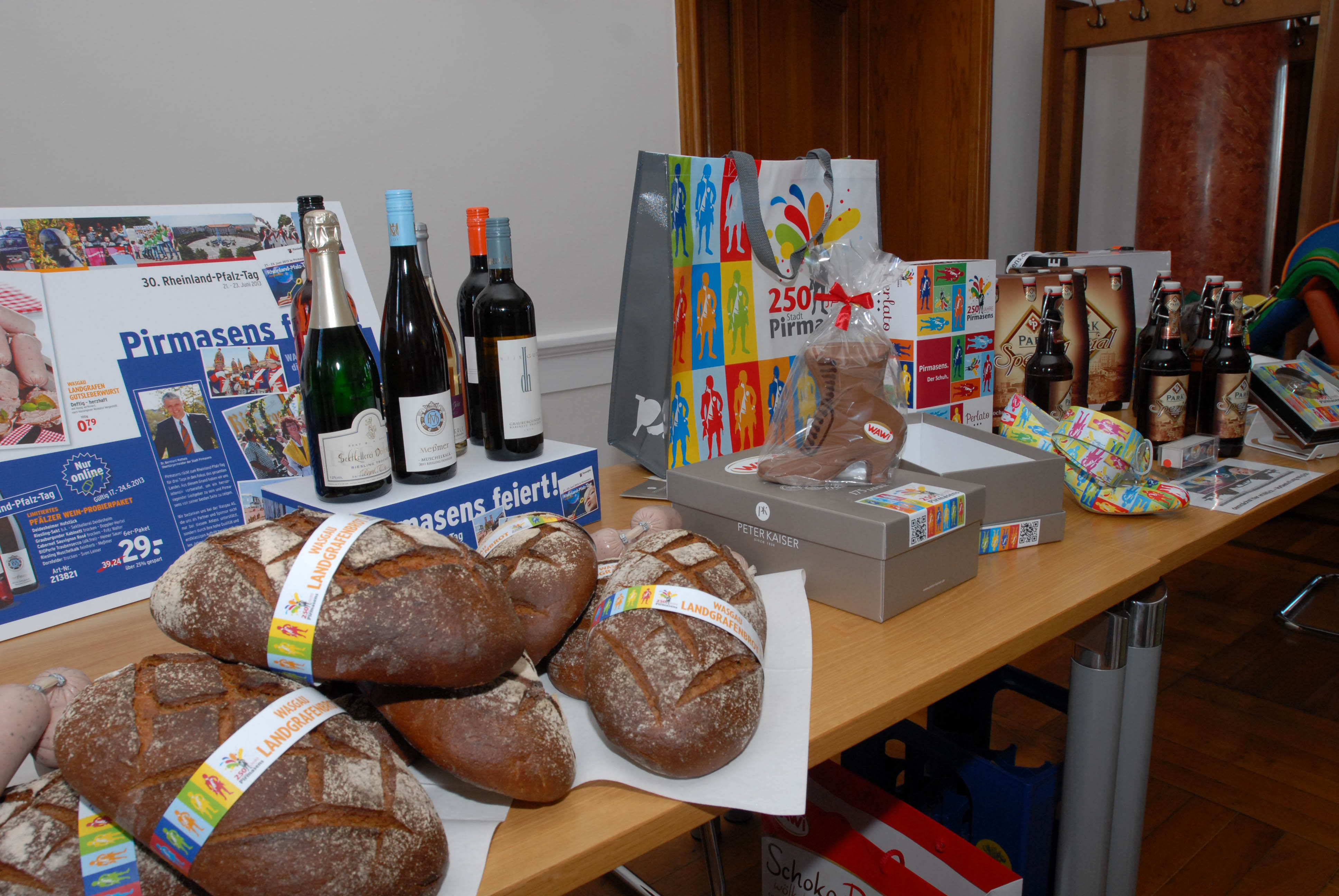 Zahlreiche Exklusivprodukte mit farbenfrohem Design des Logos zur 250-Jahr-Feier zeigen hohe Identifikation der Pirmasenser Geschäftswelt mit ihrer Stadt