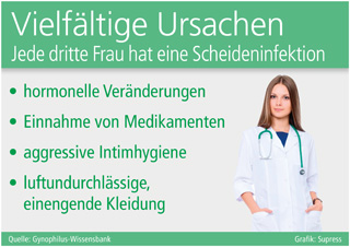 Die Symptome für eine Scheideninfektion sind veränderter Ausfluss, oft mit unangenehmem Geruch, sowie Jucken oder Brennen im Bereich des Scheideneingangs. Der Weg zum Frauenarzt lässt sich dann nicht vermeiden. Er wird je nach Verursacher der Infektion bei Bakterien ein Antibiotika und bei Pilzen ein Antimykotika verschreiben. Zum Aufbau einer gesunden Scheidenflora empfiehlt sich parallel die Anwendung von laktobazillenhaltigen Scheidenkapseln (z. B. Gynophilus), um einen Rückfall zu vermeiden. Durch die Kapseln wird die Anzahl der Milchsäurebakterien erhöht, die einen natürlichen Schutzschild gegen die Ausbreitung von schädlichen Keimen bilden und gleichzeitig für ein ausreichend saures Milieu sorgen.