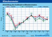 (PresseBox) - Die Wirtschaftslage im Mittelstand hat sich weiter eingetrübt. Das Creditreform Klimabarometer, der Stimmungsindikator für den österreichischen Mittelstand, verringerte sich von +17,4 Punkten im Frühjahr 2012 auf aktuell +8,5 Punkte. Sowohl Lage als auch Erwartungen notieren schwächer. Neben dem Dienstleistungsgewerbe ist die Stimmung vor allem im verarbeitenden Gewerbe deutlich verhaltener als vor Jahresfrist. Binnenwirtschaftlich orientierte Wirtschaftsbereiche stützen die Konjunktur.