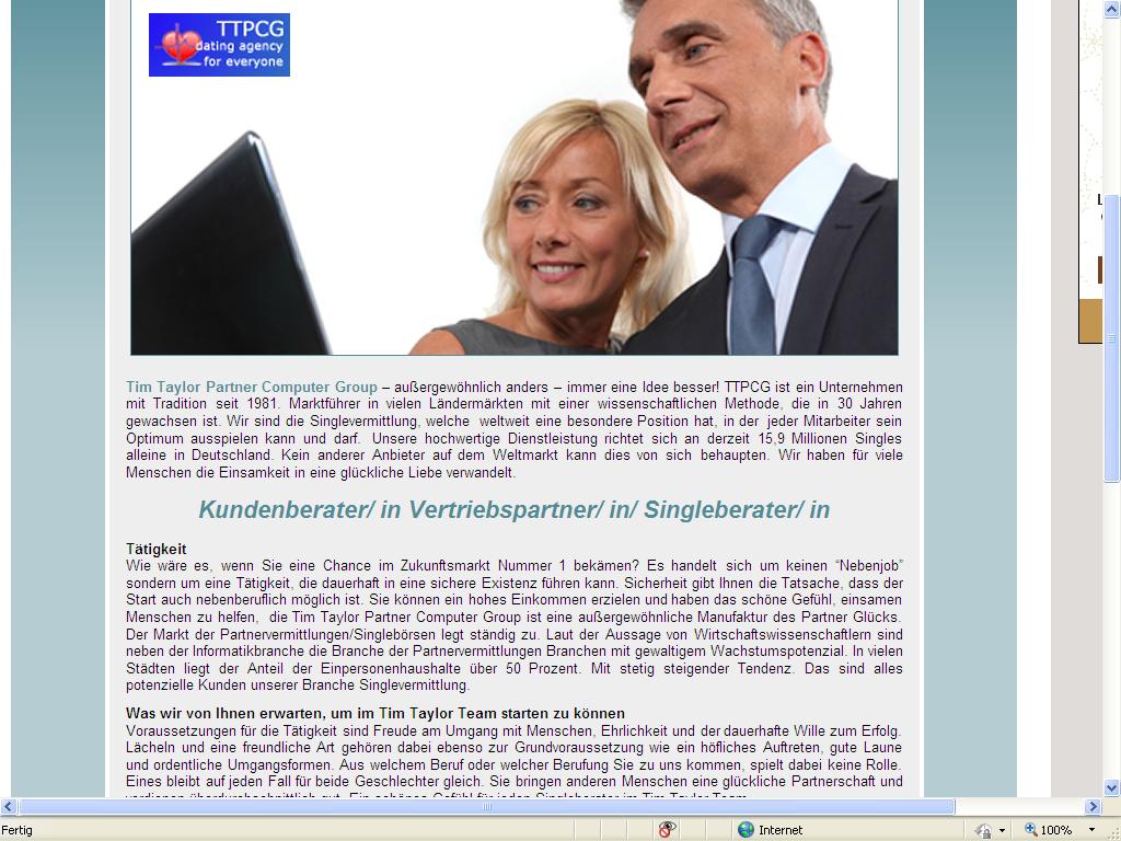 Wie bei klassischen Agenturen üblich, startet die Mitgliedschaft bei Tim Taylor durch eine persönliche und vor allem individuelle Beratung durch einen Kundenberater der erfolgreichen US amerikanischen Partnerbörse. Laut den Prognosen von führenden Wirtschaftswissenschaftlern zählt die Branche der Partnerbörsen neben der Internetbranche zu den Wirtschaftzweigen mit viel Wachstumspotenzial. Singleberater im Team TTPCG zu sein, bedeutet auch Freude an der beruflichen Herausforderung zu haben. Anderen Menschen eine glückliche Partnerschaft zu bieten, ist doch ein schönes Gefühl.