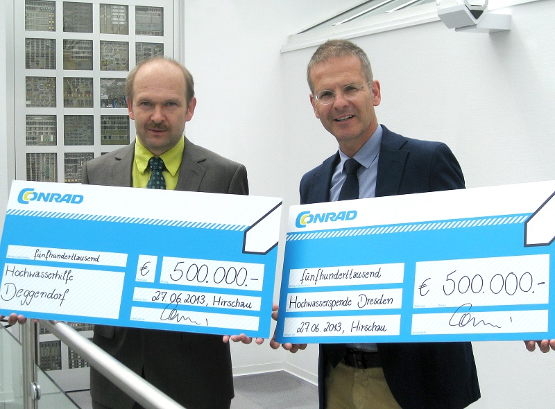 Mit der Millionenspende sollen überwiegend kleinere und mittlere Unternehmen unterstützt werden, deren Geschäftsbetrieb und Existenz durch das Hochwasser an Donau und Elbe gefährdet ist. Jeweils die Hälfte der Spende gehen an die Stadt Dresden und den Landkreis Deggendorf. Der erste Bürgermeister der Stadt Dresden, Dirk Hilbert, wird am 27.06.2013 in der Conrad Filiale Dresden von Filialleiter Jan Spaczek einen Scheck über 500.000 Euro in Empfang nehmen.