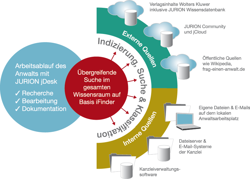 Um die anspruchsvollen Anforderungen der Anwälte bei der Recherche nach Urteilen, Fachpublikationen und Gesetzestexten zu erfüllen, setzt Wolters Kluwer auf die Lösungen von IntraFind, die wesentliche Bausteine des Gesamtsystems darstellen. Über eine einzige übersichtliche Benutzeroberfläche kann eine Vielzahl lokaler und zentraler Datenquellen durchsucht werden, beispielsweise die Verlagsinhalte von Wolters Kluwer, eigene lokale Daten des Anwalts, Dokumente und E-Mails in seiner Kanzlei, Inhalte aus der JURION Usercommunity und der JURION Cloud sowie thematisch relevante, frei verfügbare Informationen aus dem Internet (z.B. Wikipedia, frag-einen-anwalt.de).