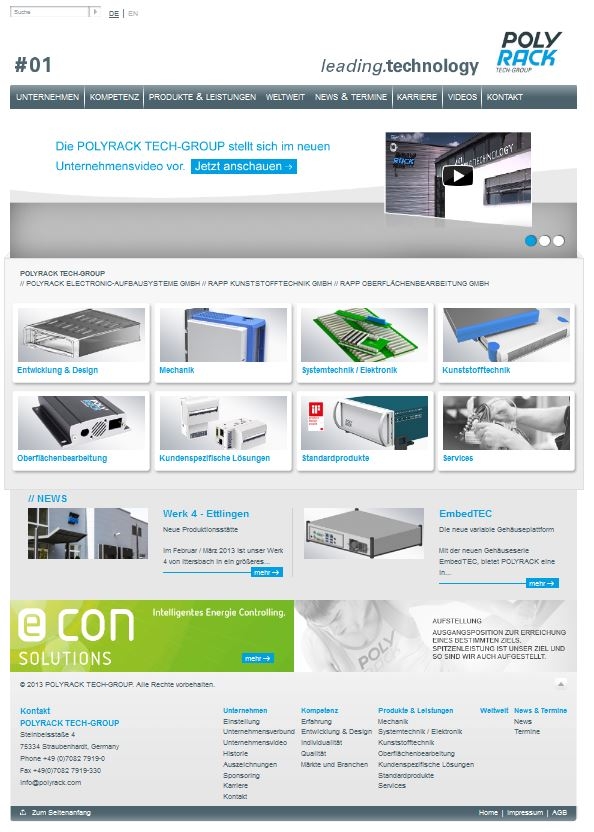 Damit verfolgt die POLYRACK TECH-GROUP das Ziel, sich noch klarer als kompetenter Technologiepartner für ganzheitliches Electronic Packaging zu präsentieren. Diese Ausrichtung basiert auf dem breiten Leistungsspektrum der Unternehmensgruppe: Zur POLYRACK TECH-GROUP gehören die Unternehmen RAPP Kunststofftechnik GmbH, RAPP Oberflächenbearbeitung GmbH, POLYRACK Electronic-Aufbausysteme GmbH sowie die econ solutions GmbH. Mit Niederlassungen in der Schweiz, in den USA und China ist POLYRACK weltweit tätig. Im Mittelpunkt des neuen Auftritts stehen die acht Dienstleistungsbereiche der Gruppe: Entwicklung & Design, Mechanik, Systemtechnik/Elektronik, Kunststofftechnik, Oberflächenbearbeitung, Standardprodukte, kundenspezifische Lösungen und Services.