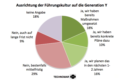 Dabei gibt es je nach Segment eine sehr unterschiedliche Bereitschaft, die Führungskultur an die Bedürfnisse der Generation Y anzupassen. Im Durchschnitt gaben 44 Prozent der Unternehmen an, hier Pläne zu haben bzw. diese bereits umgesetzt zu haben. Wenig Bereitschaft attraktiver für junge Mitarbeiter zu werden sind Anbieter von mittel- und niedrigpreisigen B2C-Dienstleistungen, die nur zu 33 Prozent Aktivitäten umsetzen oder planen. Das Schlusslicht bilden jedoch die Hersteller von B2B Produkten, die nur zu 31 Prozent attraktiver für junge Mitarbeiter werden wollen.