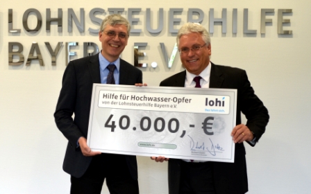 (IINews) - Einen Spendenscheck in Höhe von 40.000 Euro konnte Robert Dottl, Vorstandsvorsitzender der Lohi (Lohnsteuerhilfe Bayern e.V.) jetzt an Kai Pleuser von "Aktion Deutschland Hilft", dem Bündnis deutscher Hilfsorganisationen, überreichen. "Wir wissen, was es bedeutet, Hilfe zu leisten. Als erfolgreiches Unternehmen sehen wir uns in der sozialen Verantwortung und möchten dort helfen, wo die Not derzeit am größten ist", betonte der Vorstandsvorsitzende. Der Lohnsteuerhilfeverein betreut bundesweit in über 350 Beratungsstellen rund 525.000 Mitglieder bei allen Fragen rund um die Einkommensteuer - darunter auch zahlreiche Beratungsstellen an vom Hochwasser betroffenen Orten wie zum Beispiel Pirna, Meißen, Passau und Deggendorf.