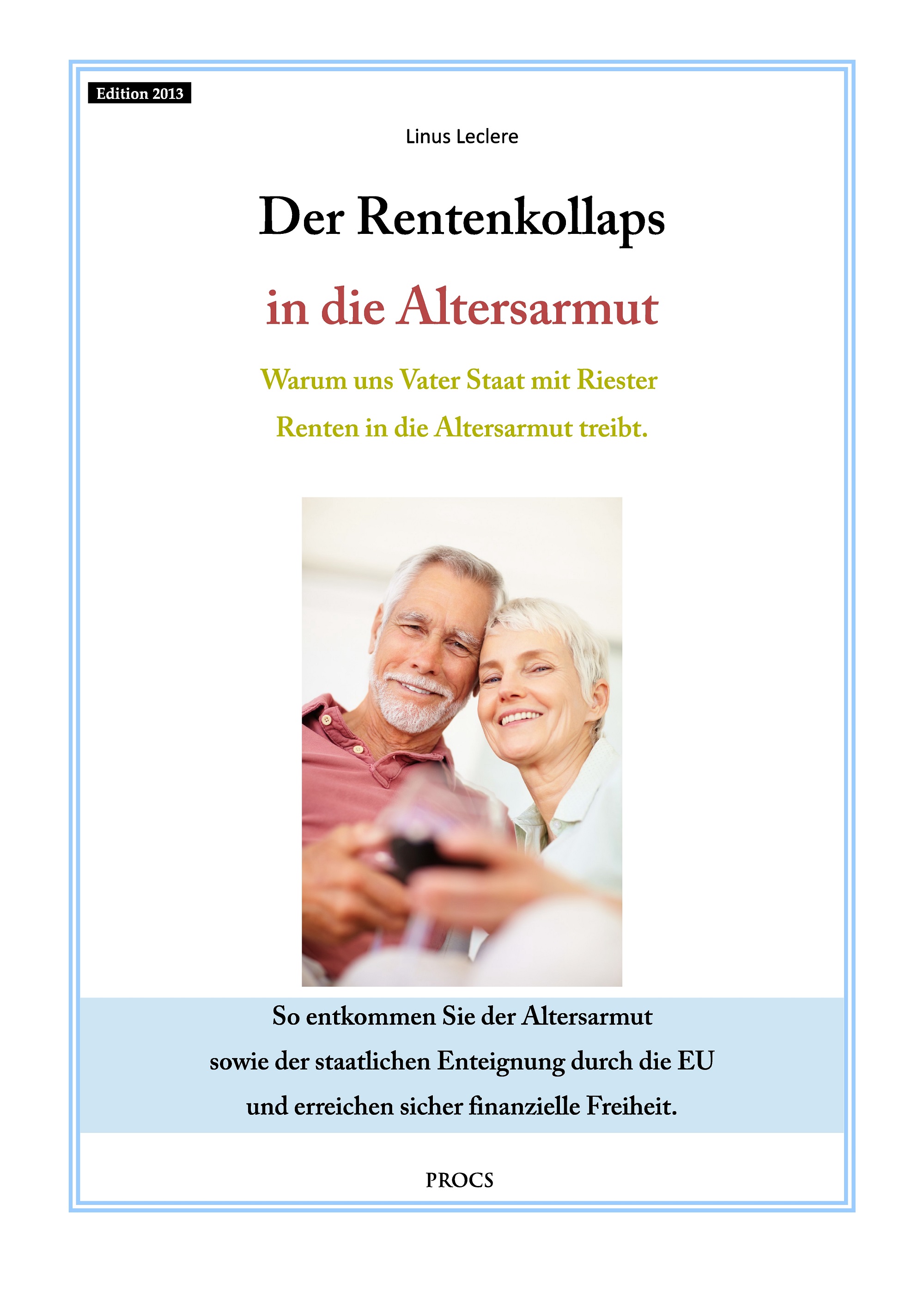 Der Finanzexperte Linus Leclere bietet dem Leser mit seinem neuen Ratgeber -Der Rentenkollaps in die Altersarmut- einen genauen Leitfaden um einen Ruhestand in finanzieller Freiheit zu erlangen und gleichzeitig die eigenen Ersparnisse vor Verlusten und Enteignung zu schuetzen. Hierzu gibt er dem Leser konkrete Regeln an die Hand und zeigt sinnvolle, alternative Anlagemoeglichkeiten auf, die sich für jedermann eignen.