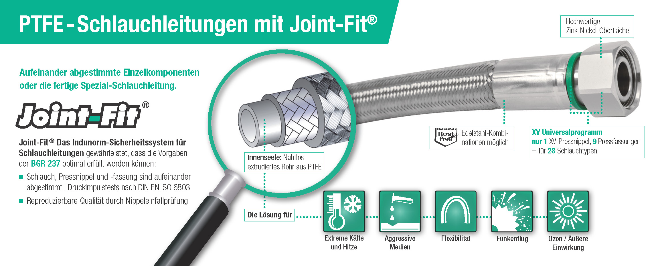 Die Anforderungen an die Beständigkeit und Sicherheit von Schlauchleitungen und ihrer Komponenten steigen permanent. Auch Sauberkeit sowie die einfache und leichte Reinigung werden immer wichtiger. Um die erhöhten Anforderungen der Kunden erfüllen zu können, hat Indunorm die Herstellung von PTFE-Schlauchleitungen noch sicherer gemacht. Mit der Indunorm patentierten Prüftechno-logie Joint-Fit® wird bei der Herstellung jeder PTFE-Schlauchleitung eine 100%ige Fertigungsendkontrolle vorgenommen. Das bedeutet für alle Hydraulik-Service-Betriebe und Konfektionäre in der Industrie, die mit Joint-Fit® PTFE-Schlauchleitungen fertigen, "Sicherheit hoch 2" oder auch "zwei Fliegen mit einer Klappe". Besonders bei flüssigen Medien in Verbindung mit hohen Temperaturen, hat absolute Dichtigkeit und Beständigkeit der Schlauchleitung höchste Priorität. Die Qualität der Joint-Fit®-Schlauchleitungen übertrifft die entsprechenden Normen DIN EN ISO 982 Maschinenrichtlinie, DIN EN ISO 1402, DIN EN ISO 6803, DIN EN ISO 20066 deutlich und reproduzierbar und die Erfüllung der berufsgenossenschaftlichen Richtlinien (BGR 237).