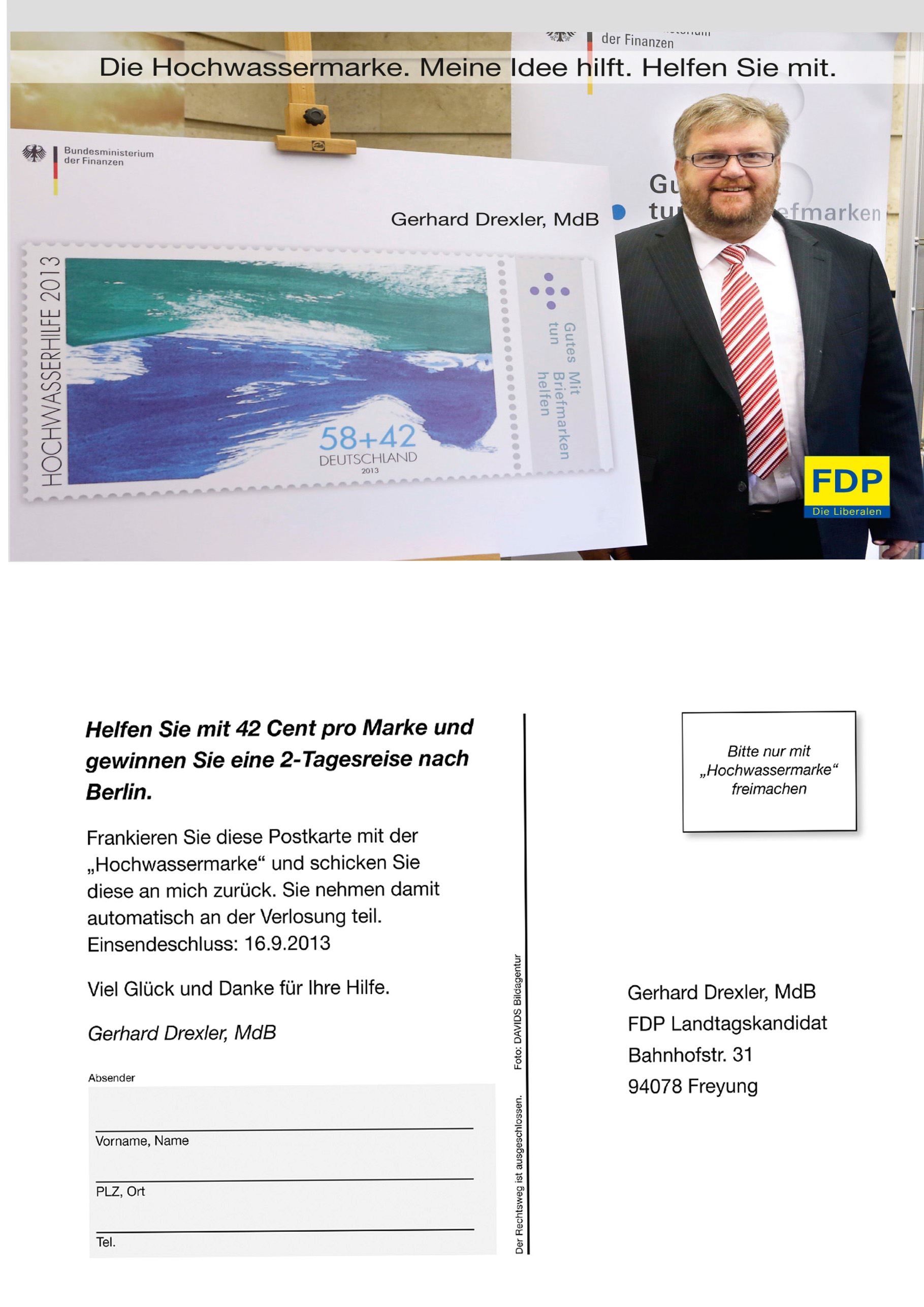Auf Vorschlag des FDP-Bundestagsabgeordneten Gerhard Drexler hat Bundesfinanzminister Wolfgang Schäuble die Sonderbriefmarke eingeführt. Der Zuschlag in Höhe von 42 Cent geht direkt an die Flutopfer. Mit der Marke kann die Bevölkerung schnell und unbürokratisch helfen, so der FDP-Politiker. "Es sollen möglichst viele Postkarten an mich zurückkommen", hofft er. "Jede zurückgesandte Postkarte hilft mit 42 Cent."
