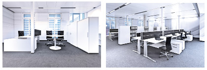 Bei der Ausstattung der rund 230 Arbeitsplätze entschieden sich die Verantwortlichen des BID für die Systemlinien iMOVEC mit Lowboard in verkürzter Ausführung sowie iMOVEF und iSCUBE. Die iMOVE-Reihe punktete im Auswahlprozess vor allem durch volle ergodynamische Steh-Sitz-Funktionalität. Innerhalb von wenigen Sekunden lassen sich die Tischplatten kontrolliert per Hand hochfahren und absenken. Dies unterstützt spontane Haltungswechsel zwischen Sitzen und Stehen.