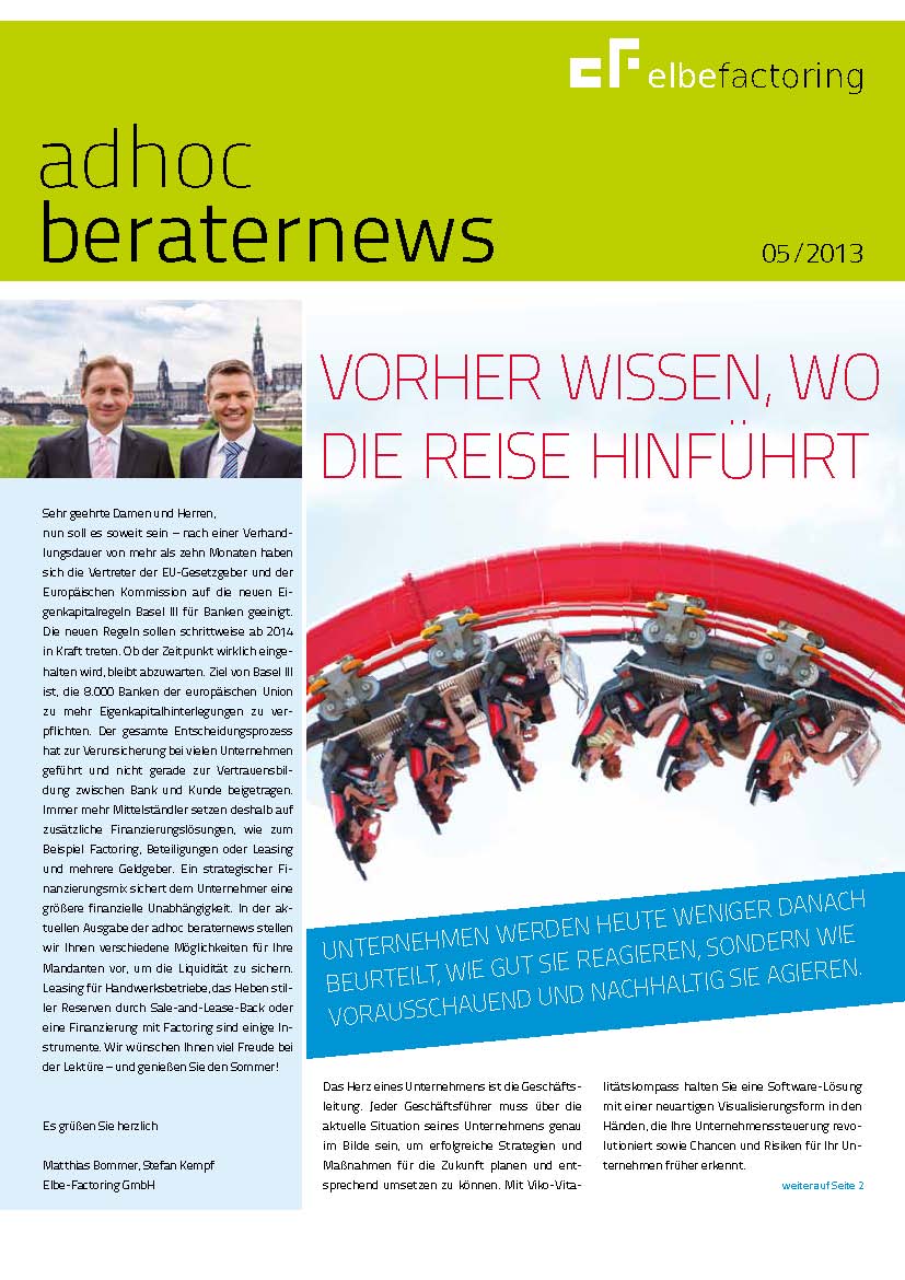 (IINews) - (Dresden, 05. August 2013) Die Elbe-Factoring GmbH gibt die fünfte Ausgabe des Magazins adhoc beraternews heraus. Das Magazin vermittelt Beratern Wissen, Tipps und Trends für den Arbeitsalltag. Das Aufhängerthema des aktuellen Heftes ist: "Vorher wissen, wo die Reise hinführt". Die Leser werden außerdem informiert, was Leasing für Handwerksbetriebe leisten kann und warum dem Mittelstand eine Finanzierungslücke droht. Welche Herausforderungen Basel III für Unternehmer bringt und wie sich interne Liquiditätsreserven heben lassen, sind weitere Themen. Zusätzlich gibt es im Magazin eine aktuelle Veranstaltungsübersicht zu Beraterfrühstücken und Webinaren.