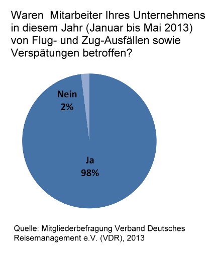 88 Prozent der befragten Unternehmen gaben an, dass bei ihnen von Januar bis Mai 2013 zwischen 10 und 30 Prozent sowohl der gebuchten Flüge als auch der Zugverbindungen ausgefallen sind. Die "Ausfallquote" auf der Schiene ist nach Aussage der VDR-Mitglieder höher als in der Luft. Denn 12 Prozent der Befragten teilten mit, dass zwischen 30 und 50 Prozent der gebuchten Zugfahrten nicht stattgefunden haben.