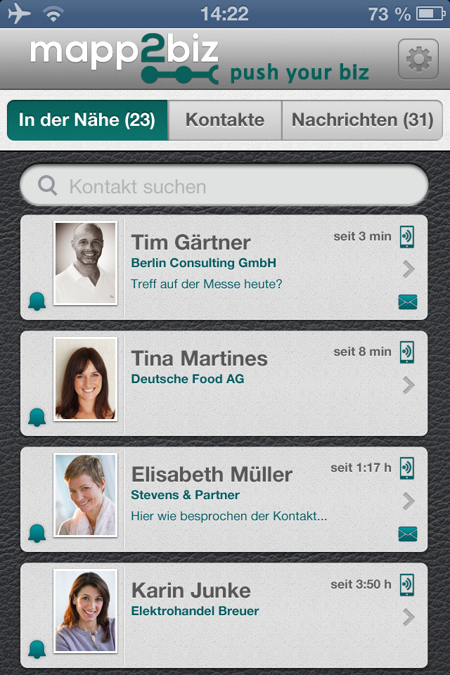 mapp2biz bietet dem Nutzer neben den üblichen Funktionen von Networking-Apps noch weitere Möglichkeiten, die auf XING und der dazugehörigen App selbst, nicht verfügbar sind. So können sich Nutzer via Push-Nachricht über relevante Kontakte in der Nähe informieren lassen. Diese Kontaktliste kann vorher in den Einstellungen individuell festgelegt werden. Erscheint die Meldung, kann über die integrierte Chat-Funktion direkt Kontakt aufgenommen werden.