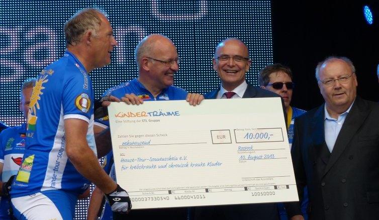 Essen/Berlin, 10. August 2013. Die ETL-Stiftung „Kinderträume“ überreichte Spendenschecks an den Verein Hanse-Tour-Sonnenschein zugunsten der diesjährigen Förderprojekte: 10.000 EUR erhält die Kinderkrebsklinik Rostock, 2.000 EUR gehen an die Neubrandenburger Kita Stolpersteinchen.