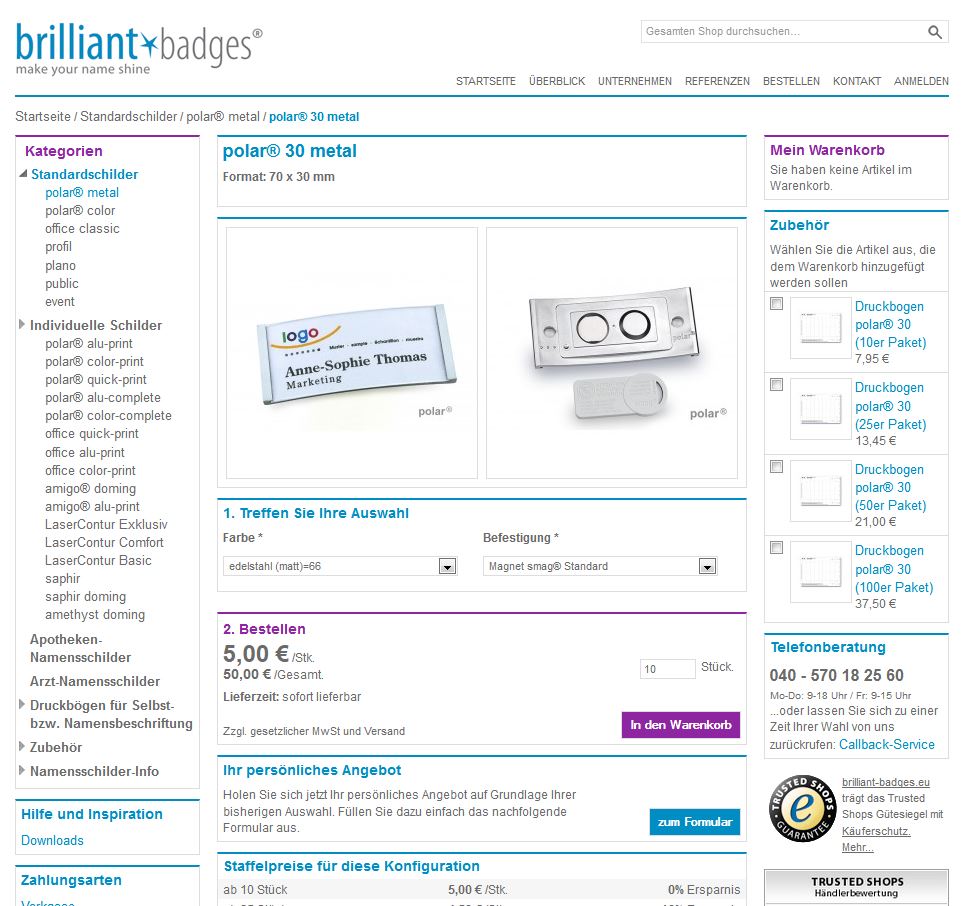 Der Online-Shop unter der Namensschilderpräsenz www.brilliant-badges.de erreichbar, erleichtert das Finden des richtigen Namensschilder-Typen, bietet einen Downloadbereich für die Word-Druckvorlagen, viele Detailfotos der Namensschilder und gibt zusätzlich nützliche Informationen zu den verschiedenen Namensschildern, den Materialien und den unterschiedlichen Befestigungen.