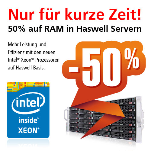 Zum Start der neuen egino Server Modelle mit Intels neuen Xeon Prozessoren auf Haswell Basis erhalten Käufer bei der primeLine Solutions GmbH 50 Prozent Preisnachlass auf die verbauten RAM Speichermodule. Das Angebot gilt so lange der Vorrat reicht, maximal jedoch bis zum 30.09.2013.