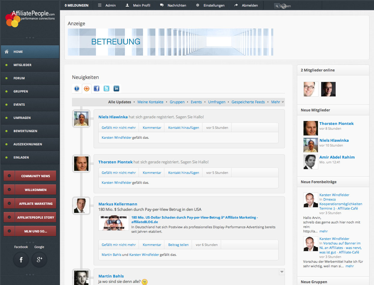 In einer scheinbar schon längst ergrauten Vergangenheit, in einer Zeit vor Facebook, Xing-Gruppen & Co. gab es blühende Communities in speziellen Internet-Foren zu allen erdenklichen Themen. Moderne soziale Netzwerke haben dann mit Attraktivität und technischen Innovationen die Kommunikation auf ihre Plattformen verlagert. Viele Foren mussten neue Wege finden, wie auch die Affiliate Marketing Community Affiliate People von Karsten Windfelder. Er betreibt seit über 10 Jahren www.100partnerprogramme.de, die größte Informationsplattform für Affiliate Marketing im deutschsprachigen Internet. „Die Community verkümmerte. Es fand fast keine Kommunikation zwischen den Mitgliedern mehr statt.“ erinnert sich Windfelder wehmütig. Die Community Affiliate-People.de wurde in Winterschlaf versetzt. Entsprechende Foren wurden nun parallel auf Facebook, Xing und LinkedIn geführt.