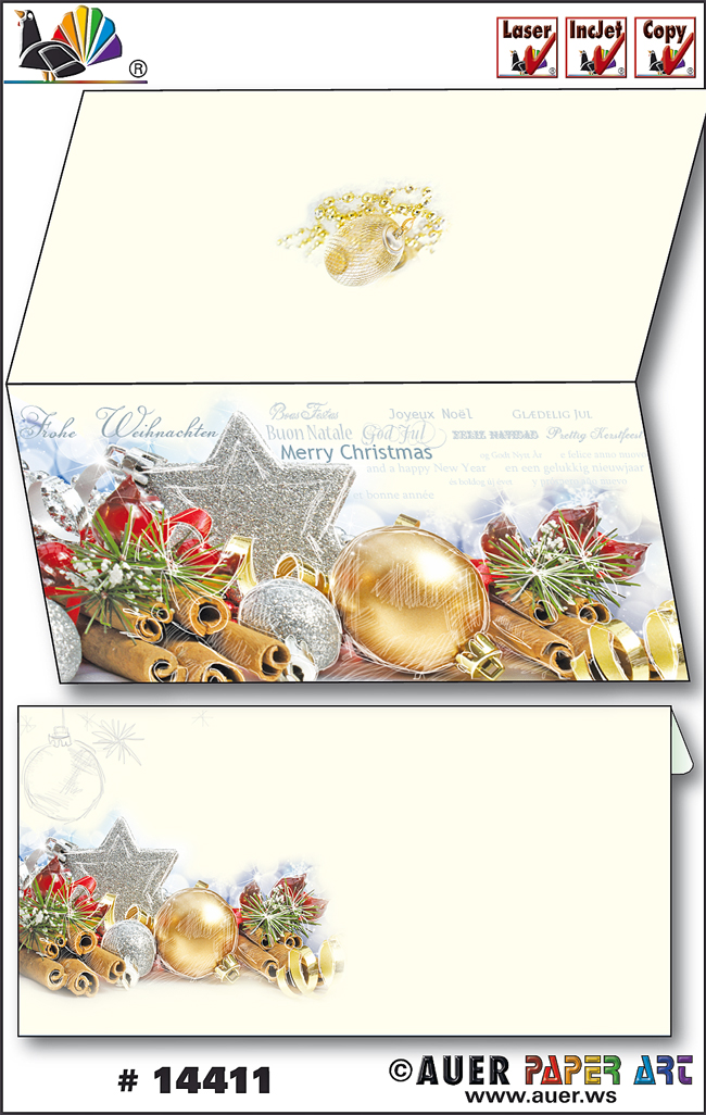 Weihnachtsgrußkarten zum selbst bedrucken und gestalten mit dem eigenen PC und Drucker - ein geniales Produkt von Auer Paper Art, dem Marktführer für PC Weihnachtskarten und Weihnachtsbriefpapier. Bestellen Sie Motivpapier für Weihnachten und Weihnachtskarten mit passenden Briefumschlägen bequem online.