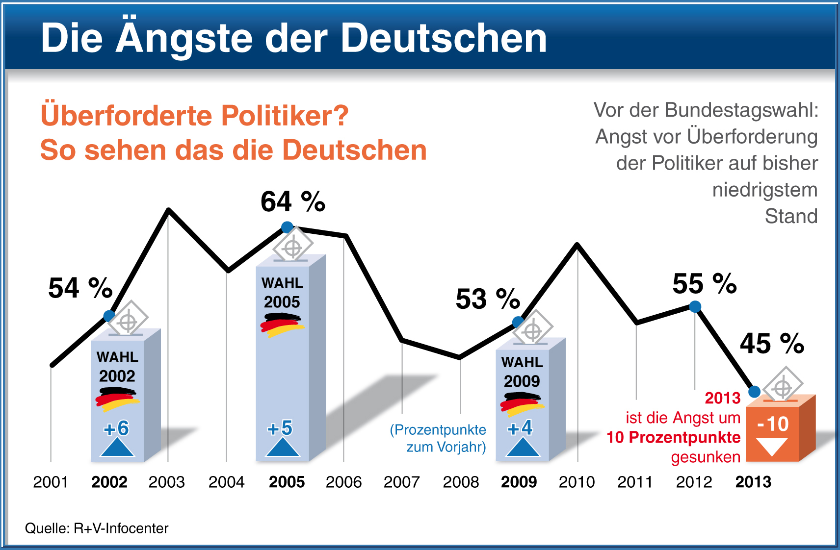 Die Überraschung der diesjährigen Ängste-Studie: Die deutschen Bürger machen sich um die Überforderung ihrer Politiker weniger Sorgen als bisher. Im Vorjahr mit 55 Prozent noch auf Platz 2 der größten Sorgen sinkt diese Angst um 10 Prozentpunkte auf 45 Prozent und rutscht damit auf den 6. Rang. Im Jahr 2001 hat das R+V-Infocenter die Deutschen zum ersten Mal gefragt, ob die Politiker von ihren Aufgaben überfordert seien. Ihren Spitzenwert erreichte diese Sorge im Jahr 2003 mit 66 Prozent. Interessant: Vor Bundestagswahlen stieg der Wert immer an: 2002 um 6 Prozentpunkte, 2005 um 5 Prozentpunkte, 2009 um 4 Prozentpunkte. In der Langzeitbeobachtung zeigt sich ein Zusammenhang zwischen Wirtschaft und Politik: "Wenn die Furcht vor einer schlechteren Wirtschaftslage zurückgeht, sinkt auch die Sorge vor der Überforderung der Politiker", so Professor Schmidt.