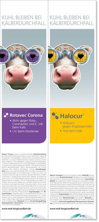 Kälberdurchfall lautete der erste zu vergebende Indikationsbereich. Aufgabe war es, für Rotavec® Corona und Halocur® einen Dachmarkenauftritt zu generieren, der den Systemgedanken beider Marken herausarbeitet. Das in der Zielgruppe mit einem Bekanntheitsgrad von über 80 Prozent ausgewiesene Kuhmotiv, die Produktfarben violett und gelb und der etablierte Slogan „Kuhl bleiben bei Kälberdurchfall“ sollten dabei erhalten bleiben.
