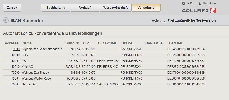 Auch größere Datenbestände lassen sich innerhalb kurzer Zeit konvertieren. Die aus den bestehenden Kontonummern und Bankleitzahlen errechneten IBAN-/BIC-Daten werden automatisch in Collmex bei den jeweiligen Kunden- oder Lieferantendaten hinterlegt.