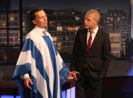 spielt der Tonmann der Sendung - selbst Grieche - ihm bei einer Rede