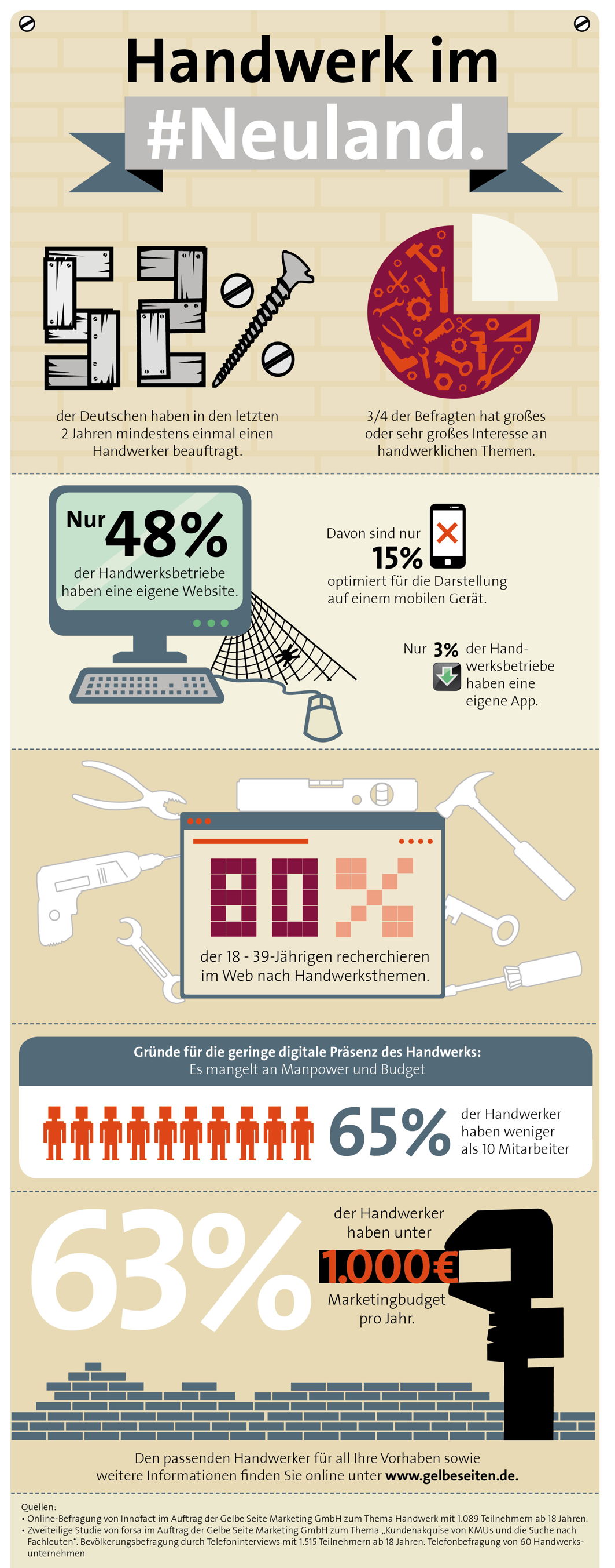 Die Handwerker in Deutschland sind auf diese Entwicklung jedoch nur unzureichend vorbereitet, wie eine weitere Studie ergab. Das Marktforschungsinstitut forsa(2) fand im Auftrag von Gelbe Seiten Marketing heraus, dass lediglich 48 Prozent der Handwerker über eine eigene Webseite verfügen. Ein Grund für die geringe Online-Präsenz ist der Mangel an personellen und finanziellen Ressourcen in den Unternehmen. Fast zwei Drittel der deutschen Handwerksbetriebe (65 Prozent) haben weniger als zehn Mitarbeiter und auch die Mittel für Werbung sind gering. Bei 62 Prozent der Handwerker liegt das Marketingbudget bei unter 1.000 Euro pro Jahr.