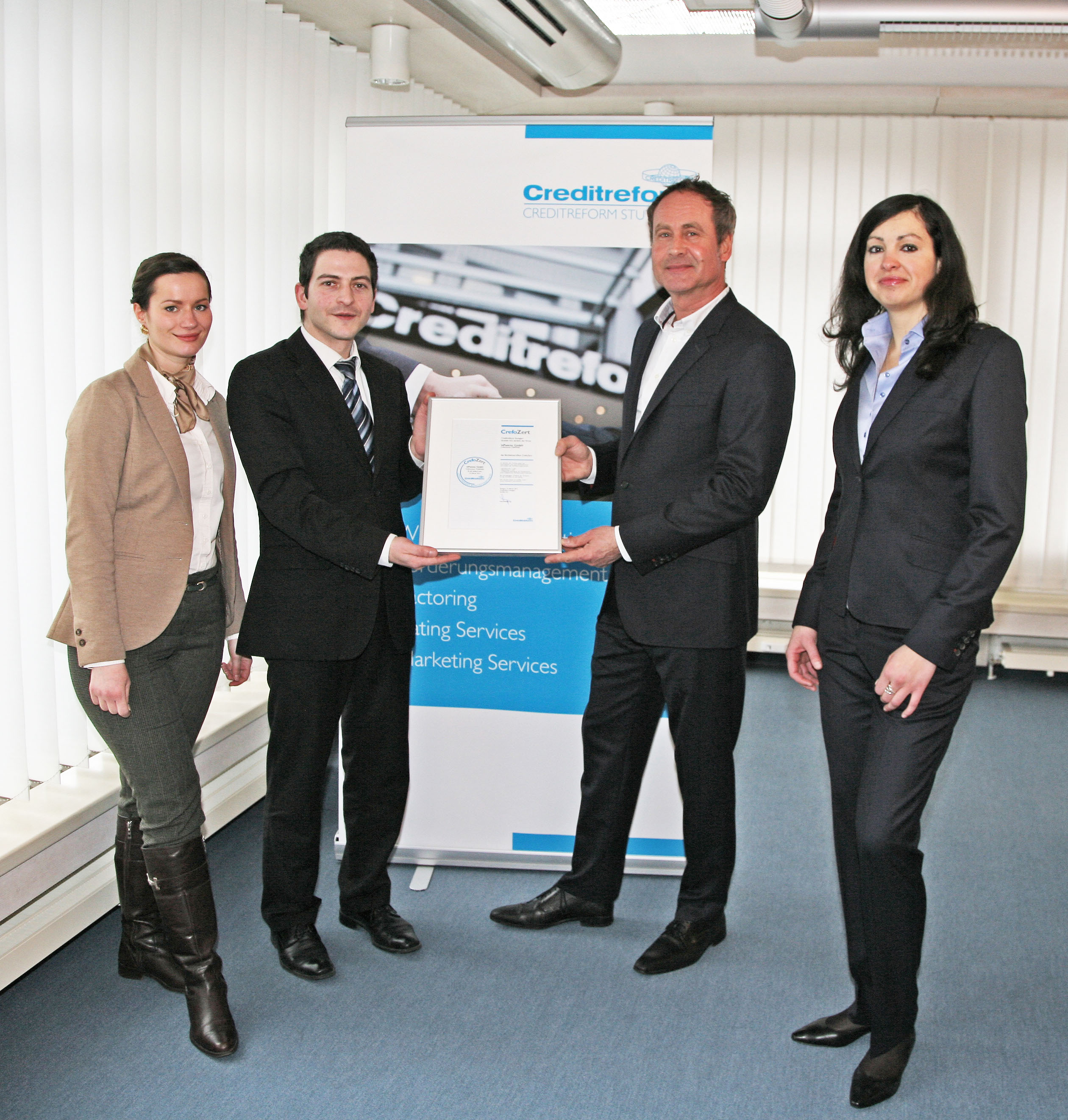 Für inPuncto ist es bereits das zweite Zertifikat in diesem Jahr. Bereits im Februar 2013 wurde dem Unternehmen das Creditreform Bonitätszertifikat (CrefoZert) verliehen. Damit gehört das Softwareunternehmen zu einem kleinen, exklusiven Kreis deutscher Unternehmen, denen durch CrefoZert eine außergewöhnlich gute Bonität, Seriosität sowie gute Zukunftsperspektiven bescheinigt werden. Denn das Zertifikat wird ausschließlich Unternehmen erteilt, die keinerlei Bonitätsrisiken erkennen lassen. Bislang wurden bundesweit nur 570 Unternehmen zertifiziert. Creditreform-Firmenberater Thomas Hoffmann hob bei der Verleihung die herausragende Stellung eines Zertifikatsinhabers heraus: "Lediglich 1,7 Prozent aller deutschen Unternehmen können diese Zertifizierung aufgrund der strengen Kriterien überhaupt erlangen."