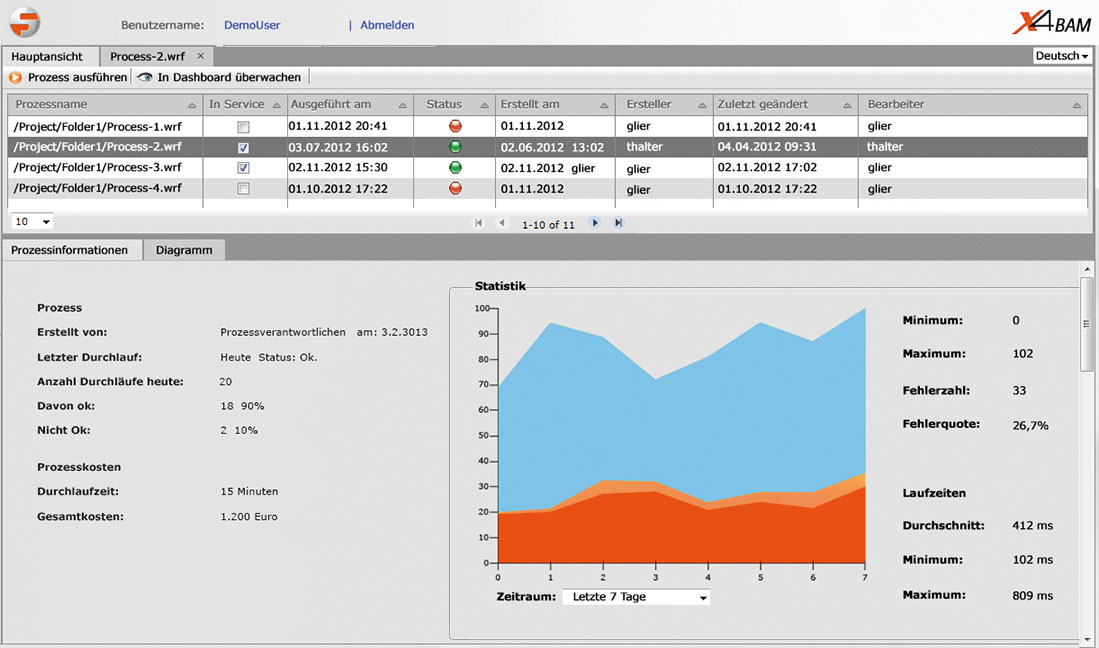 Über Business Activity Monitoring (BAM) können Unternehmen bestehende X4-Prozesse gezielt überwachen und steuern. Zudem hilft BAM bei der Fehlerbehebung und ermöglicht es, Probleme wie Datenüberlastung, lange Antwortzeiten und Verletzungen der Service-Level-Bestimmungen zu identifizieren. Funktionsübersicht: