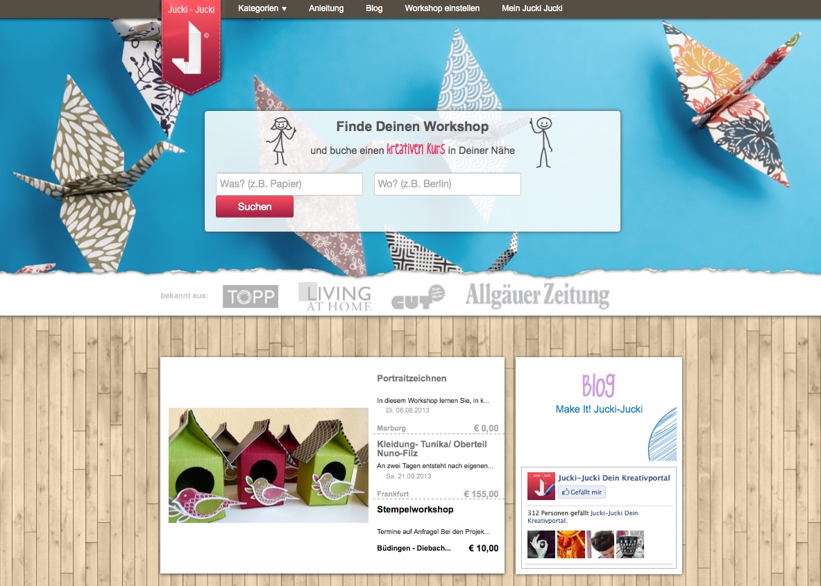 ÜBER JUCKI-JUCKI: Mit Jucki-Jucki startet das erste Buchungsportal für Kreativ-Workshops im Internet. Ziel ist es, Könner aus der ?Do-it-yourself?-Szene und Anfänger näher zusammenzubringen. Jucki-Jucki.com bietet Bastlern, Kreativen und Künstlern eine gut sichtbare Plattform für ihre Kursangebote. Dabei kann jeder seine Workshops kostenfrei online stellen ? vom kleinen Laden bis zum talentierten Bastler, der seine Ideen teilen möchte. Termine, Teilnehmerzahl, Kategorien und Preise können individuell festlegt sowie Kursbeschreibungen, Bilder und Videos hinzugefügt werden. Und das alles innerhalb von nur fünf Minuten. Das Buchungsportal bietet momentan über 300 verschiedene Kursthemen an. Dabei reicht die Bandbreite von Schmuck, Heimtextil, Papier, Ton- und Keramikarbeiten, Malen und Zeichen, Fotografie bis hin zu Arbeiten mit Holz, Metall und Stein. Der Kreativität sind keinen Grenzen gesetzt.
