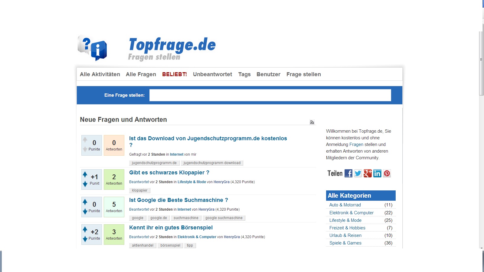 Topfrage.de bietet daher was es verspricht. Es bietet die Möglichkeiten schnell Fragen zu stellen und auch zu beantworten ohne langes Registrieren oder Warten.
