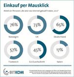 Im europäischen EU-Vergleich fallen starke regionale Unterschiede auf. Der Einkauf im Internet ist vor allem in Nord- und Westeuropa populär: Am größten ist der Anteil der Online-Shopper mit 76 Prozent in Norwegen. Es folgen Schweden (74 Prozent), Dänemark und Großbritannien (je 73 Prozent) sowie Luxemburg (68 Prozent). Deutschland teilt sich mit den Niederlanden und Finnland Rang 6. Eine weit geringere Rolle spielt der private E-Commerce hingegen in den Ländern Süd- und Osteuropas. So lag der Anteil der Online-Shopper in Spanien (31 Prozent), Italien (17 Prozent) oder Rumänien (5 Prozent) deutlich unter dem EU-Durchschnitt. Ein Grund: Die Internet-Nutzung ist in südeuropäischen Ländern generell niedriger.