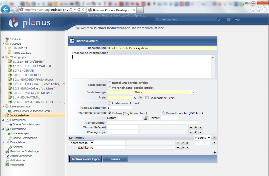 Plenus Business Procure Desktop erleichtert es Unternehmen, regelmäßig benötigtes Verbrauchsmaterial zu beschaffen. Dazu lassen sich komplette Lieferantenkataloge einlesen und Warenkörbe externer Webshops anbinden. Die Mitarbeiter nutzen das System wie einen hausinternen Webshop, der mit dem eigenen ERP-System integriert ist. "Spezielle Artikel und Dienstleistungen, die nicht in den Katalogen oder angebundenen Webshops enthalten sind, lassen sich mit dem neuen Modul für Online-Preisanfragen schnell und unkompliziert per Freitext anfordern und auf einen Blick vergleichen", sagt Harald Voll, Geschäftsführer von Plenus. "Bisher mussten die Einkäufer in solchen Fällen bei verschiedenen Lieferanten per Telefon, Fax oder E-Mail anfragen und die Angebote meist manuell in Excel eintragen und auswerten."