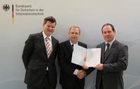 (PresseBox) - Bernd Kowalski, Abteilungspräsident Sichere elektronische Identitäten, Zertifizierung und Standardisierung beim BSI, überreichte den beiden Geschäftsführern Reto Lorenz und Tobias Glemser das Zertifikat zum zertifizierten IT-Sicherheitsdienstleister für Penetrationstests.
