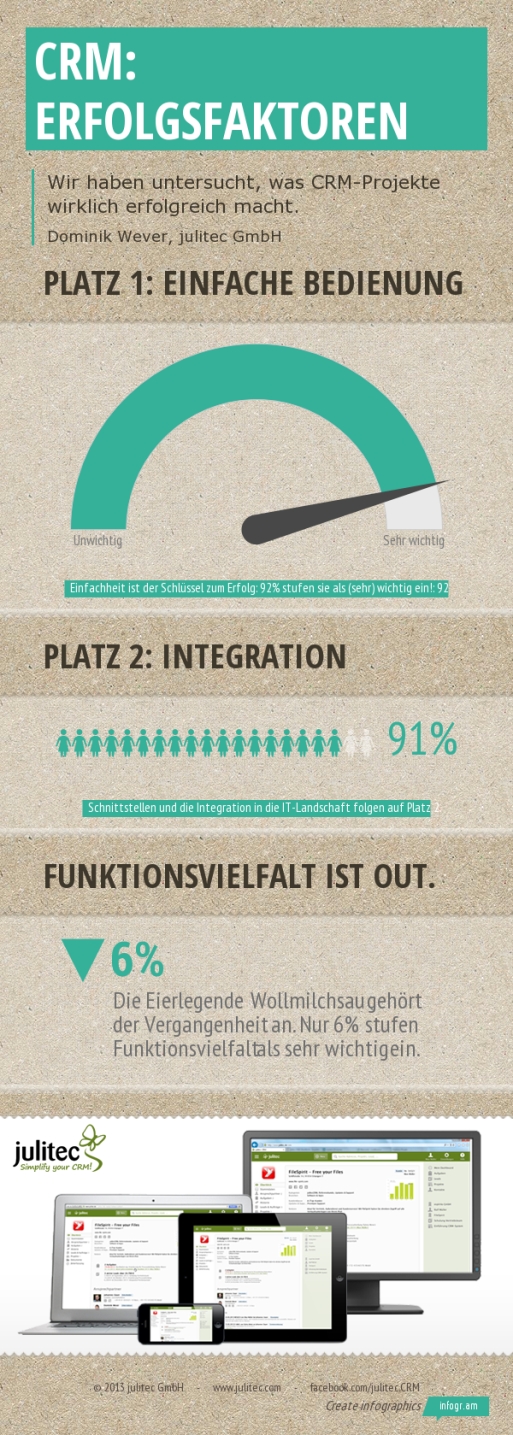 Simplify your CRM - diesem Anspruch wird die julitec GmbH mit ihrer Softwarelösung für CRM, Kontakt- und Kundenbeziehungsmanagement gerecht. Eine intuitive Bedienung, unkomplizierte Installation sowie die flexible Anpassung an die eigenen Bedürfnisse: Mit diesen Merkmalen richtet sich julitec CRM an Selbst-ständige sowie kleine und mittelständische Unternehmen, die ihre Kundenbeziehungen einfach und effektiv verwalten möchten. Dabei ist julitec CRM vollkommen branchenunabhängig und kann in allen Bereichen des Vertriebs, Marketings, der Kundenbetreuung sowie der allgemeinen Büroorganisation zum Einsatz kommen. julitec wurde vor rund 15 Jahren gegründet und ist nach wie vor ein inhabergeführtes Familienunternehmen. www.julitec.com - www.facebook.com/julitec.crm