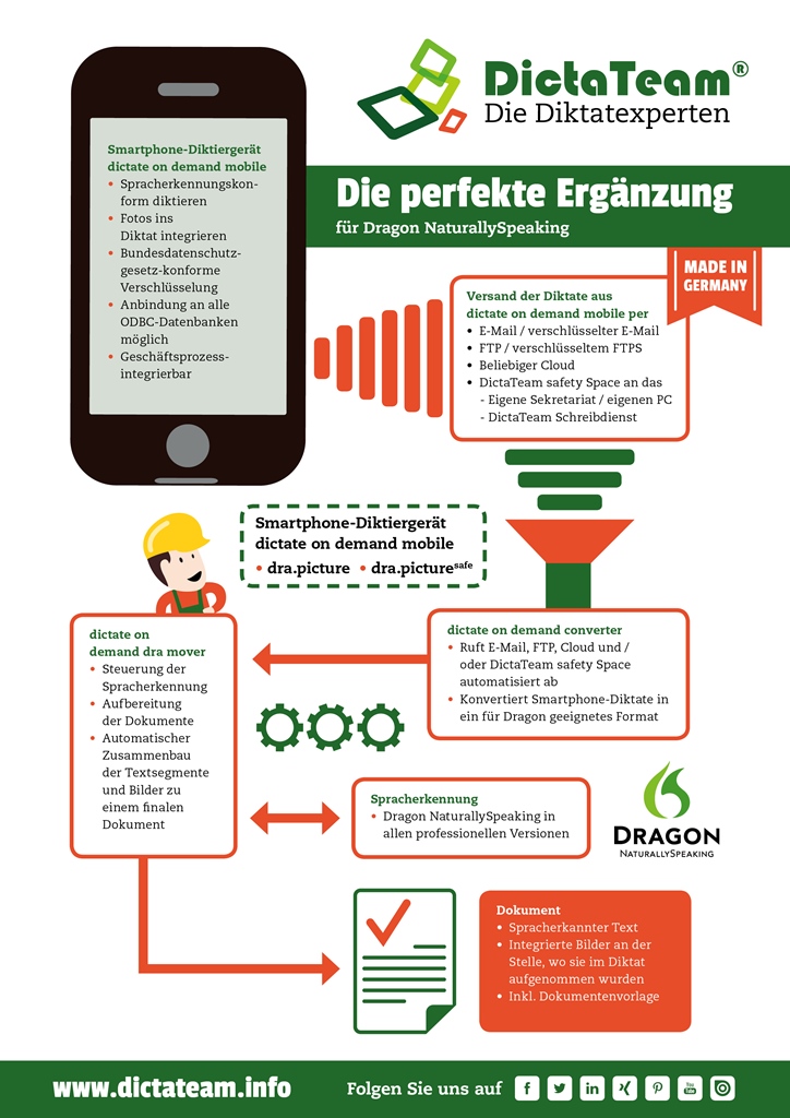 Weitere Informationen zu den Produkten von DictaTeam®, zur Philosophie und den Anwendungen finden Sie unter www.dictateam.info. DictaTeam® finden Sie auch bei Issuu, Facebook, LinkedIn, Twitter, XING, Pinterest und YouTube.